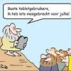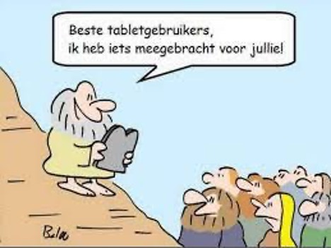 wel de eerste tablet-gebruiker. De stenen tafelen die Mozes tot twee keer toe van God kreeg – de eerste sloeg hij aan barrels – lijken een beetje op een krant. De oudste krant, maar actueler dan ooit. Als leefregels voor onderweg.